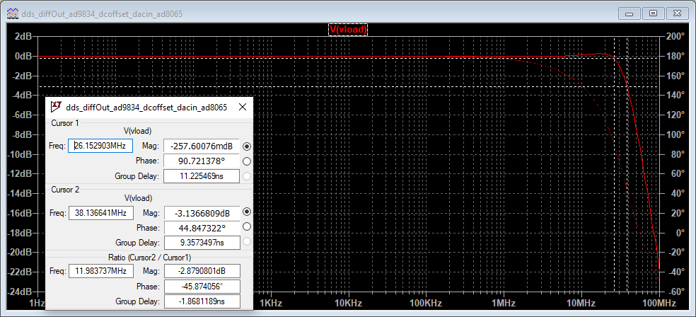 - Cursor 1 shows the point at which it starts to deviate from 0.25dB flatness area (26MHz)Cursor 2 shows the -3dB frequency (38MHz)