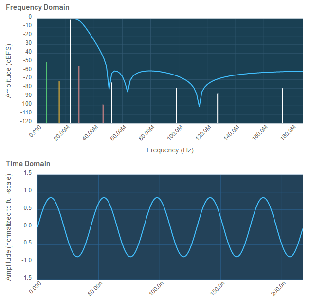 - Below shows the output of a DDS chip running at 23MHz output, after being filtered with a 7th order inverse Chebyshev lowpass filter.