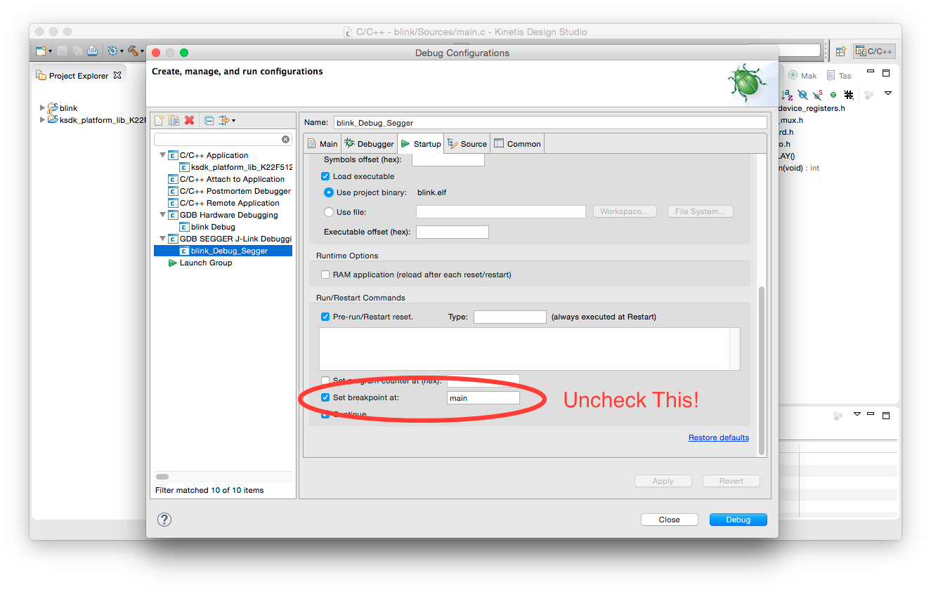 Highlight whatever debug toolchain you’ve been using. Click the “Startup” pane in the window to the right. (In my case, it’s Segger J-Link, but if you’ve been using the OpenSDA interface like the ones built into the FRDM series of dev boards, this option will still be present in the “Startup” pane.) Scroll down until you see the option “Insert Breakpoint At” line, and uncheck it. In Debug builds, KDS automatically inserts a breakpoint to allow you to monitor your program’s execution, and control when it kicks off. Since we’ll be downloading directly to a board, we’ll want our program to just run with no external stimulus besides programming completion, so a breakpoint will do us no good.