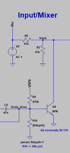 Q4 is a variable impedance because it’s base node, Vmix_drive, is modulated by a really simple low frequency oscillator.