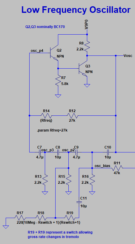 Pot R14 sets the bias point of Q2, and as a result, governs the oscillation cycle time of the LFO. A higher resistance between Vosc and osc_p4 means that the oscillator is more dependent on RC charging to toggle the oscillator state. Lower resistance, conversely, means faster oscillations. With the rate switch open, the oscillator rate ranges from about 6.5Hz to 22.6Hz. Closing the rate switch (represented here by R18/R19, and an IF() statement) allows you to further downshift the LFO to an oscillator frequency of about 2.8Hz to 7.8Hz.