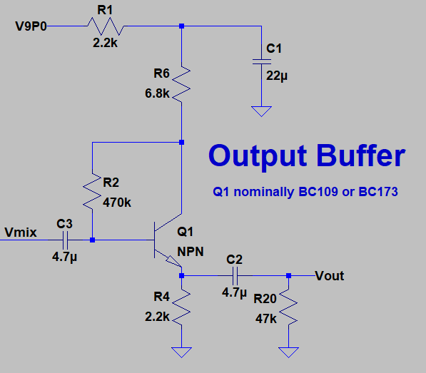 Pot R10 sets the bias point of Q4. When R10 == 0, it’s basically preventing Q4 from turning on at all. When R10 == 50k, it’s biasing Q4 such that its effectively shorting Vmix to GND. This seems kind of dumb, and by itself, it kind of is. It begins to get more interesting once you start looking at what’s driving Q4.