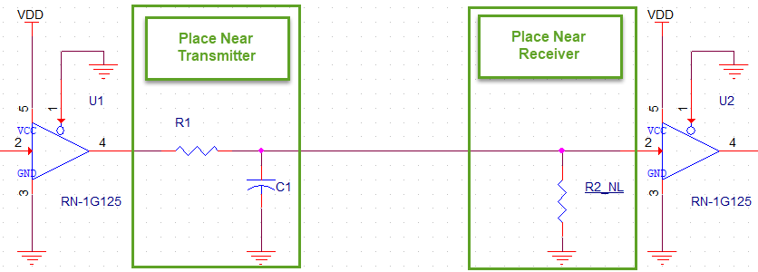 - Decrease the drive strength. This is a variation on the theme of series termination. If your transmitter comes from a big fancy application processor, you likely can adjust the drive strength of the transmitter pin. That